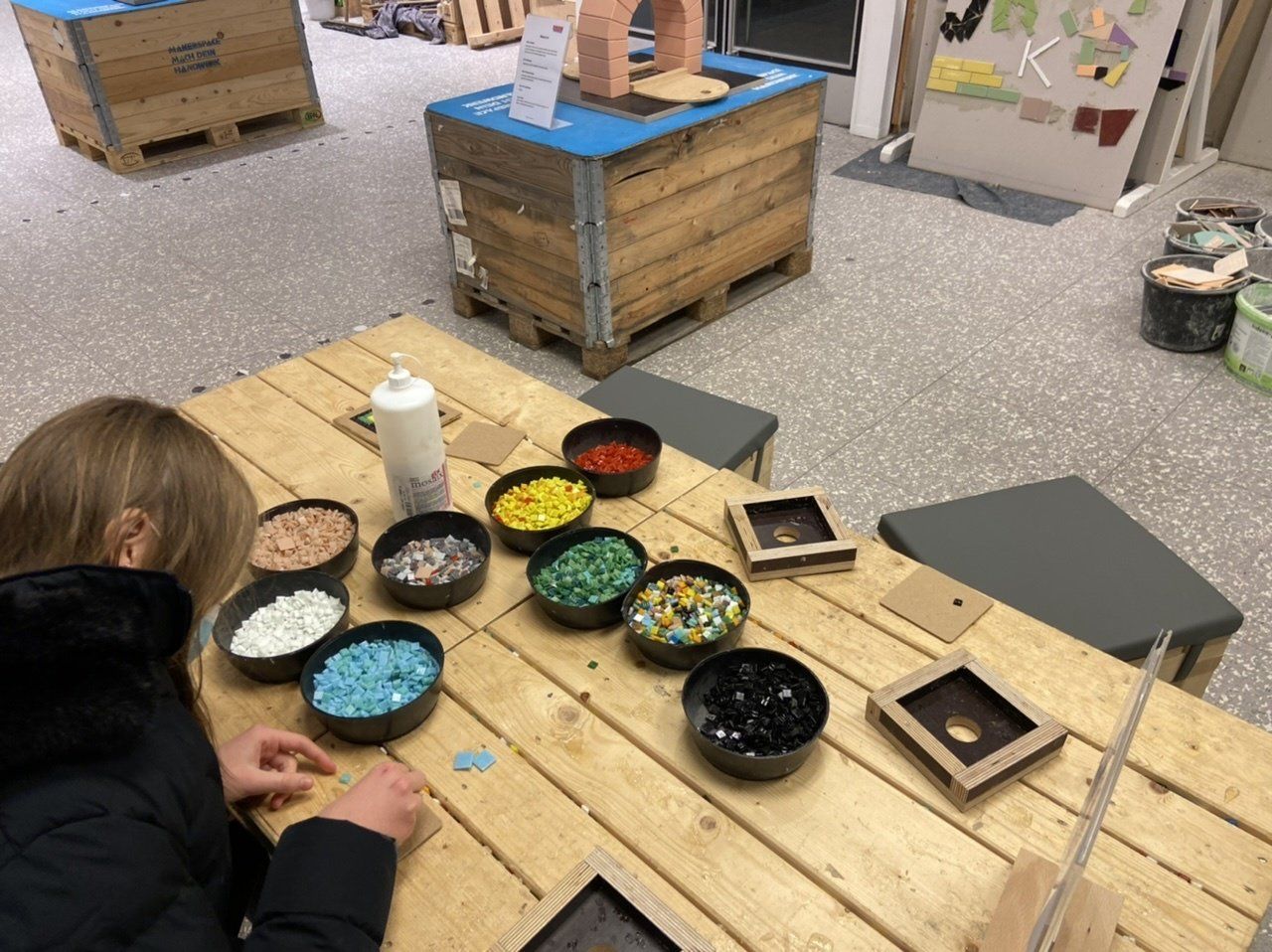 Gemeinsam mit unserer Klasse sind wir in den Makerspace der Handwerkskammer in Mainz. Nach der Vorstellungsrunde hatten wir die Möglichkeit uns viele handwerkliche Berufe näher anzuschauen und praktisch auszuprobieren. So konnten wir im Bereich des Fliesenlegers Mosaike gestalten und Fliesen legen. Das das Schneiden von Fliesen gar nicht so leicht ist, haben wir spätestens beim Legen des Erich-Kästner-Logos festgestellt. Doch gemeinsam haben wir es geschafft.